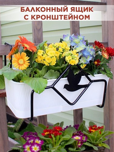 КомплектацияБалконный пластиковый ящик для цветов "Прованс" с поддоном белый 6л - 1шт; Металлический кронштейн HITSAD "Птичка" 203-001 - 1шт