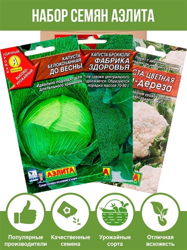 Набор семян - Семена капусты: белокочанная "До весны", брокколи "Фабрика здоровья", цветная "Коза-дереза", набор семян Аэлита 3 уп.